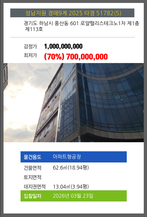 하남아파트형공장경매 하남시 풍산동 601 로얄팰리스테크노1차 제1층 제113호 №2025 타경 51782(5)