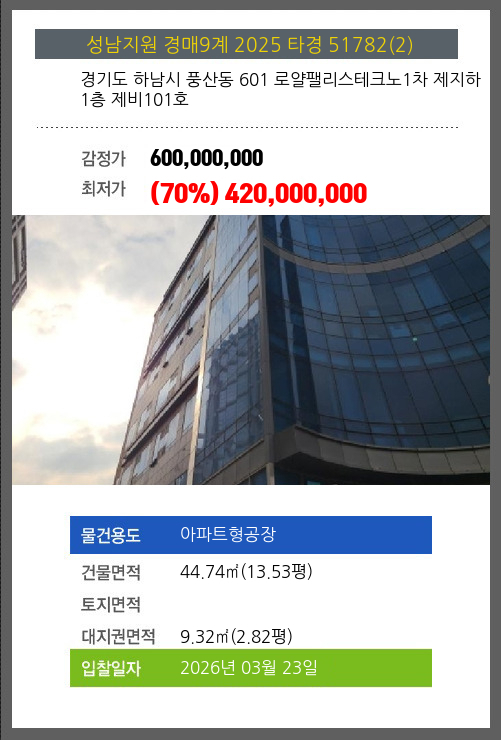 | 용도 | 아파트형공장 | 채권자 | 다** | 감정가 | 600,000,000 |