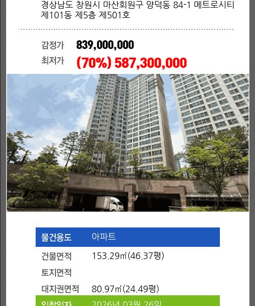 | 매각대상 | 유치권 | 경매종류 | 임의경매 | 사건접수일 | 2025-10-15 |