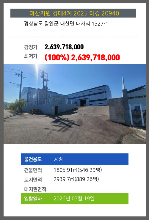| 용도 | 공장 | 채권자 | 중** | 감정가 | 2,639,718,000 |