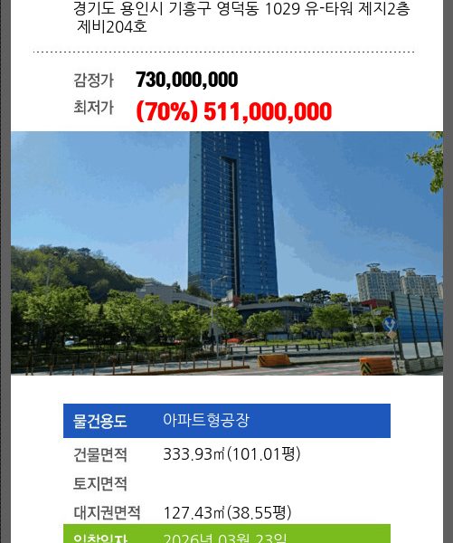 | 매각대상 | 건물전부, 토지지분 | 경매종류 | 임의경매 | 사건접수일 | 2024-07-29 |