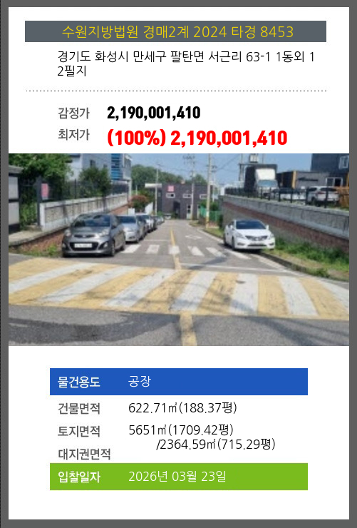 | 소재지 | [지번] 경기도 화성시 만세구 팔탄면 서근리 63-1 1동외 12필지 [도로명 주소] 경기도 화성시 팔탄면 서근내길 80 1동외 12필지 |