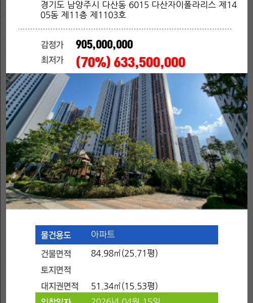 | 용도 | 아파트 | 채권자 | 남** | 감정가 | 970,000,000 |