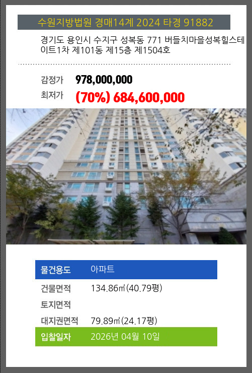 용인아파트경매 용인시 수지구 성복동 771 버들치마을성복힐스테이트1차 제101동 제15층 제1504호 №2024 타경 91882