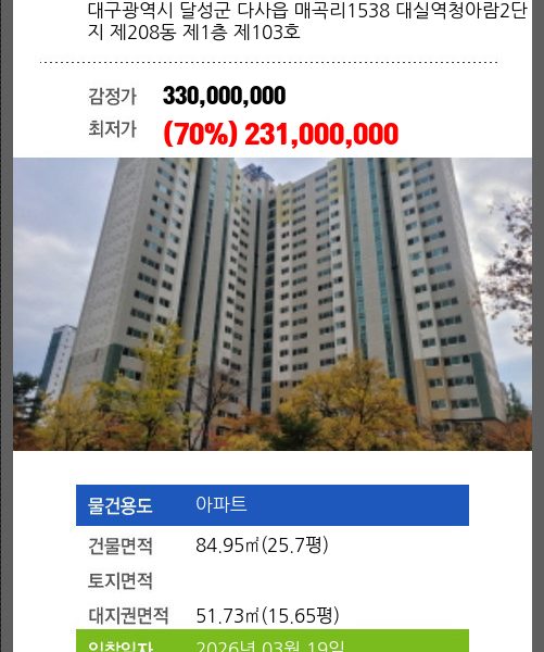 | 매각대상 | 공시가격2~3억 | 경매종류 | 임의경매 | 사건접수일 | 2025-05-09 |