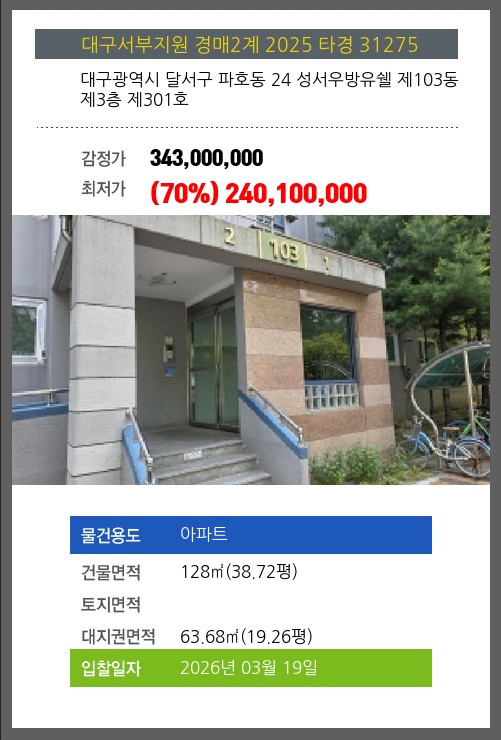 본건은 대구광역시 달서구 파호동 24 성서우방유쉘 제103동 제3층 제301호