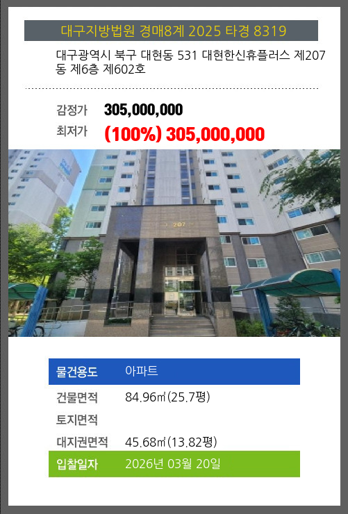 | 용도 | 아파트 | 채권자 | 새** | 감정가 | 305,000,000 |