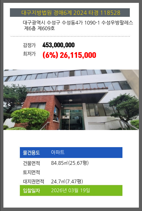 본건은 대구광역시 수성구 수성동4가 1090-1 수성우방팔레스 제6층 제609호