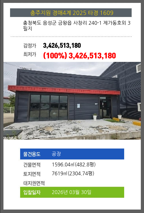 | 용도 | 공장 | 채권자 | 오** | 감정가 | 3,426,513,180 |