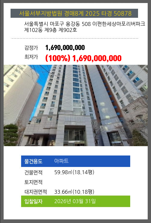 | 건물면적 | 59.98㎡ (18.14평) | 채무자 | 민**외3명 | 최저가 | (100%) 1,690,000,000 |