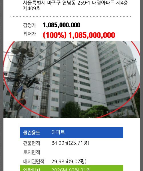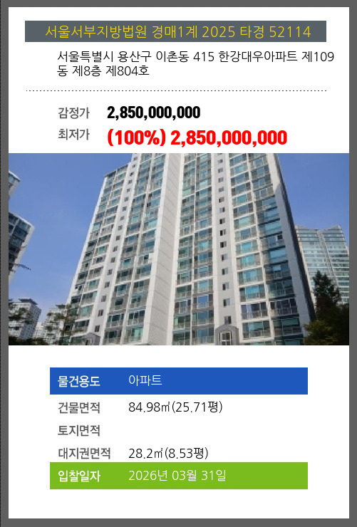 | 건물면적 | 84.98㎡ (25.71평) | 채무자 | 스** | 최저가 | (100%) 2,850,000,000 |