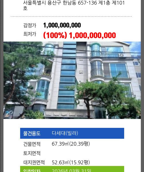 | 소재지 | [지번] 서울특별시 용산구 이촌동 415 한강대우아파트 제109동 제8층 제804호 [도로명 주소] 서울특별시 용산구 이촌로 181 한강대우아파트 제109동 제8층 제804호 |