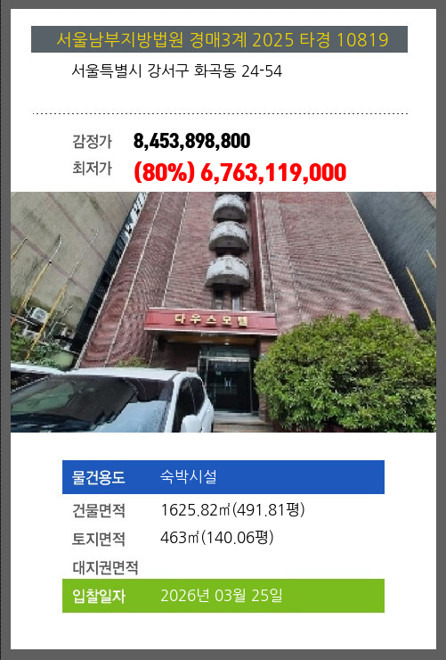 | 용도 | 숙박시설 | 채권자 | 이** | 감정가 | 8,453,898,800 |