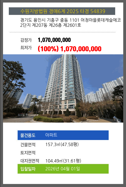 본건은 경기도 용인시 기흥구 중동 1101 어정마을롯데캐슬에코2단지 제207동 제26층 제2601호