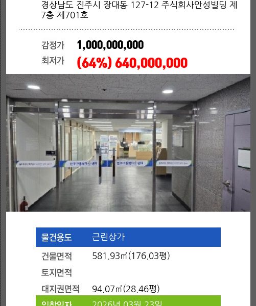 | 대지권 | 94.07㎡ (28.46평) | 소유자 | ㈜** | 보증금 | (10%) 64,000,000 |