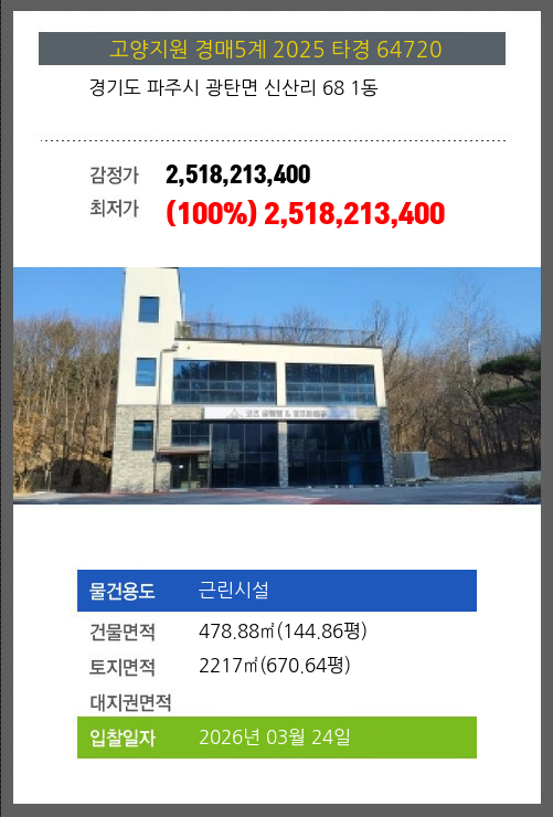| 용도 | 근린시설 | 채권자 | 리** | 감정가 | 2,518,213,400 |