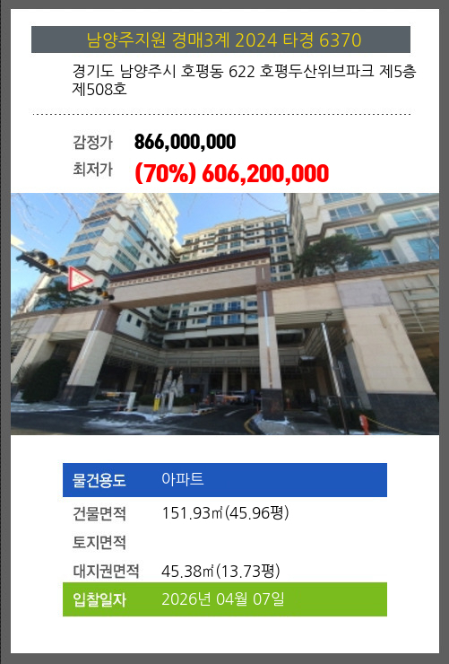 본건은 경기도 남양주시 호평동 622 호평두산위브파크 제5층 제508호