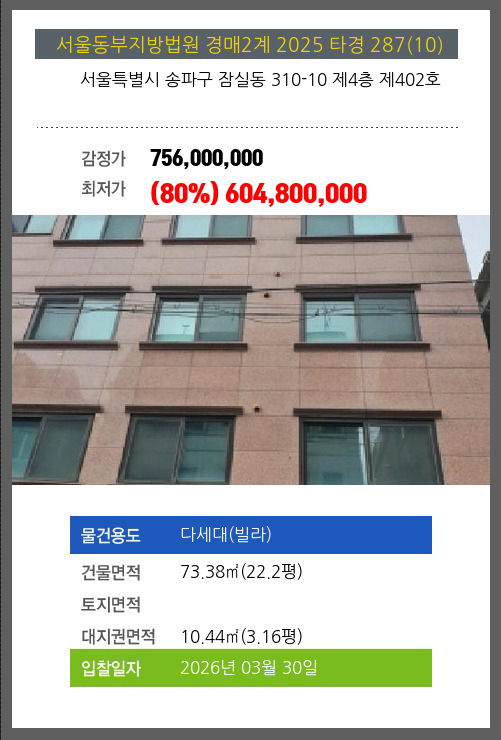 송파빌라경매 송파구 잠실동 310-10 제4층 제402호 №2025 타경 287(10)