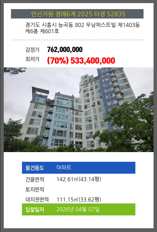본건은 경기도 시흥시 능곡동 802 우남퍼스트빌 제1403동 제6층 제601호