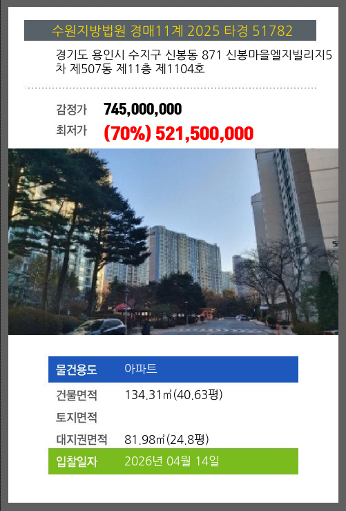 본건은 경기도 용인시 수지구 신봉동 871 신봉마을엘지빌리지5차 제507동 제11층 제1104호