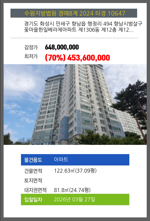 본건은 경기도 화성시 만세구 향남읍 행정리 494 향남시범살구꽃마을한일베라체아파트 제1306동 제12층 제12…