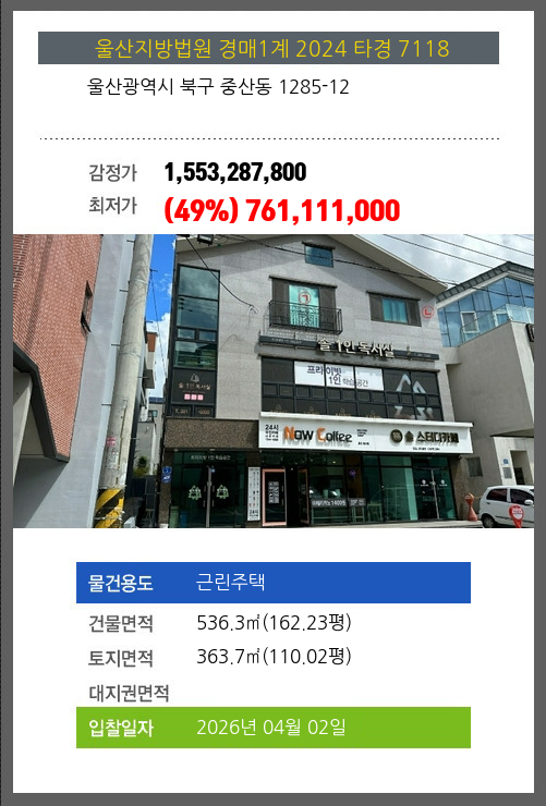 | 용도 | 근린주택 | 채권자 | 울** | 감정가 | 1,553,287,800 |