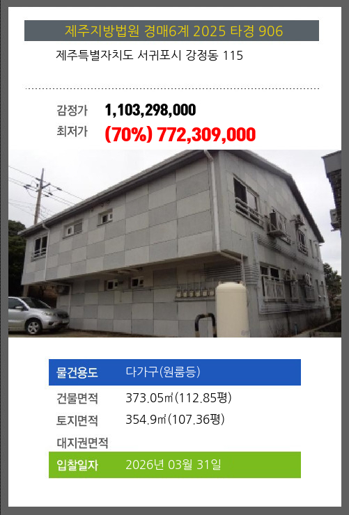 | 건물면적 | 373.05㎡ (112.85평) | 채무자 | 김** | 최저가 | (70%) 772,309,000 |