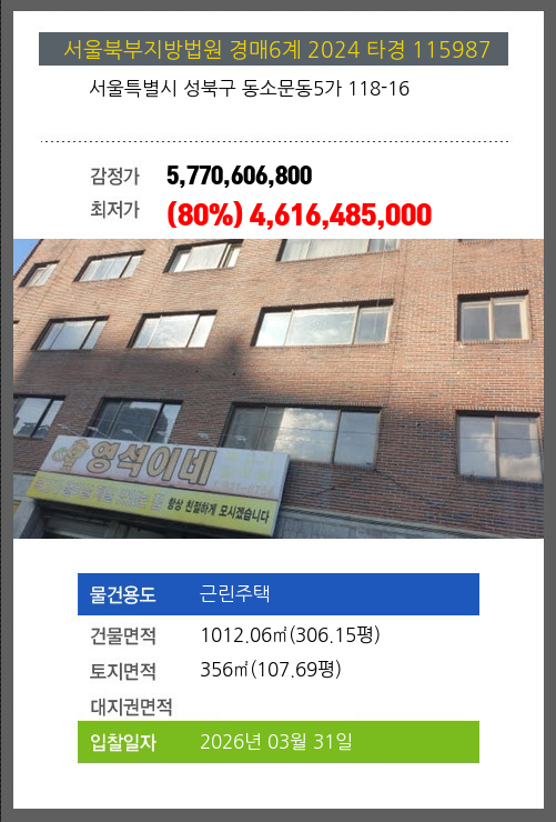 | 용도 | 근린주택 | 채권자 | 정** | 감정가 | 5,770,606,800 |