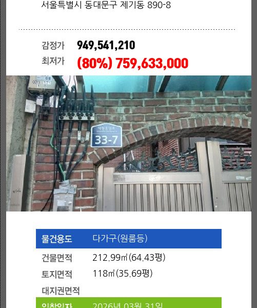 | 신건 | 2026-02-26 | 5,770,606,800 | 유찰 |