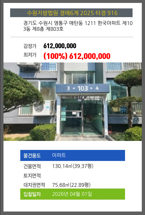 수원아파트경매 수원시 영통구 매탄동 1211 한국아파트 제103동 제8층 제803호 №2025 타경 916