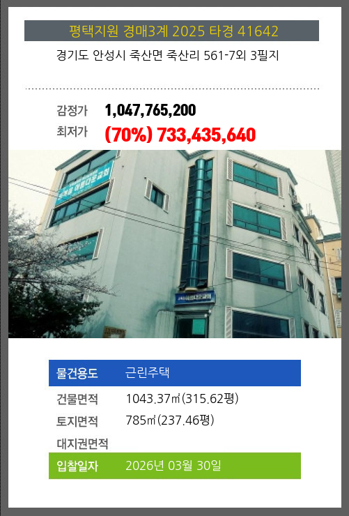 | 토지면적 | 785㎡ (237.46평) | 소유자 | 김**외2명 | 보증금 | (10%) 73,343,564 |