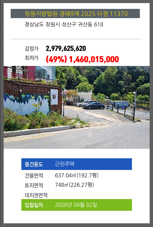 | 건물면적 | 637.04㎡ (192.7평) | 채무자 | ㈜** | 최저가 | (49%) 1,460,015,000 |