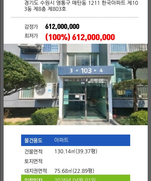 | 최초경매일 | 2026-04-01 | 배당종기일 | 2025-05-21 | 경매개시일 | 2025-02-26 |