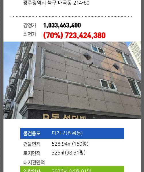 | 매각대상 | 임금채권 | 경매종류 | 임의경매 | 사건접수일 | 2025-04-28 |