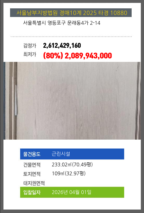 영등포시설경매 영등포구 문래동4가 2-14 №2025 타경 10880