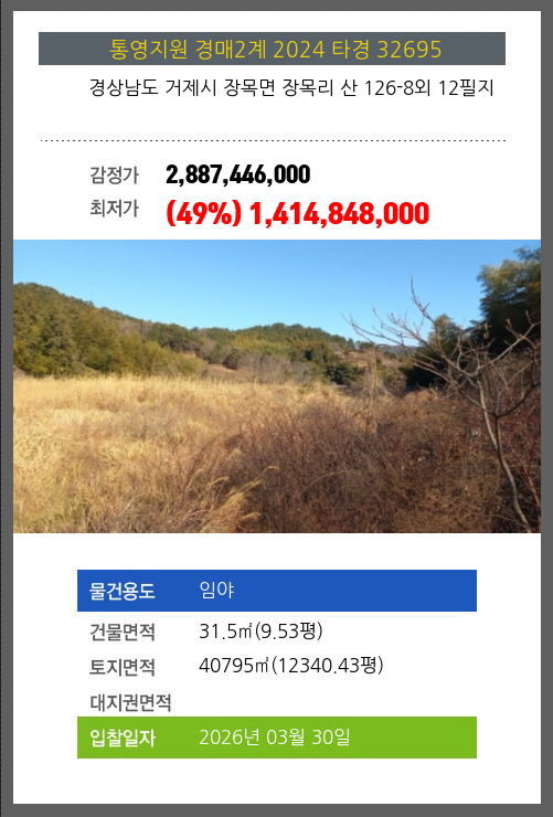 | 용도 | 임야 | 채권자 | 대** | 감정가 | 2,887,446,000 |
