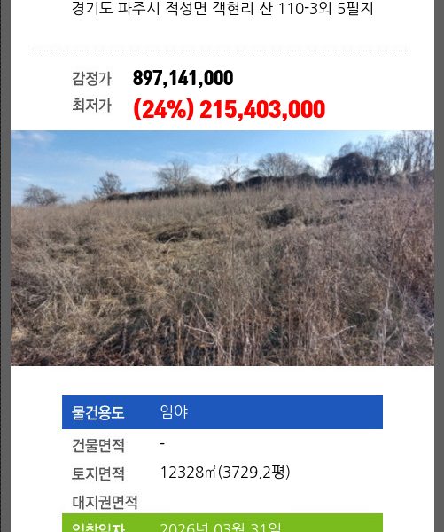 | 매각대상 | 토지만매각 | 경매종류 | 임의경매 | 사건접수일 | 2024-04-16 |