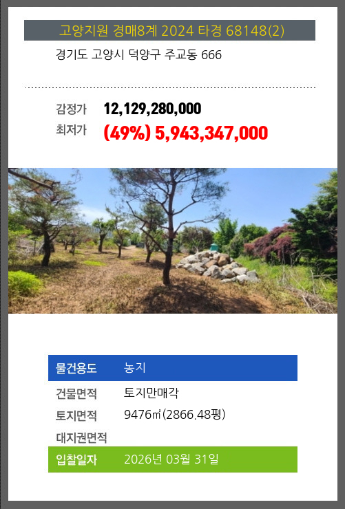 | 용도 | 농지 | 채권자 | 농** | 감정가 | 12,129,280,000 |