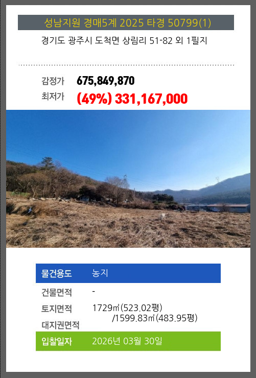 | 소재지 | [지번] 경기도 광주시 도척면 상림리 51-82 외 1필지 | ||||