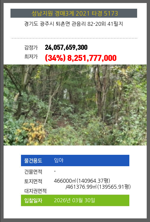 | 용도 | 임야 | 채권자 | 광** | 감정가 | 24,057,659,300 |