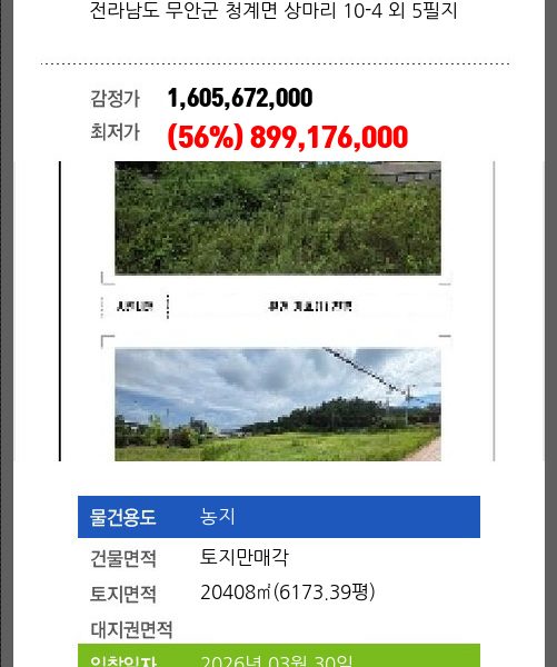 | 용도 | 임야 | 채권자 | 광**외1명 | 감정가 | 728,130,780 |