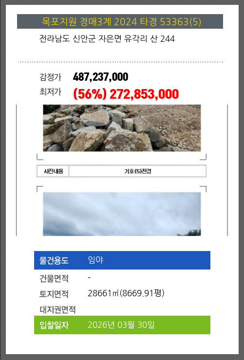 | 용도 | 임야 | 채권자 | 광** | 감정가 | 487,237,000 |