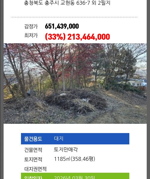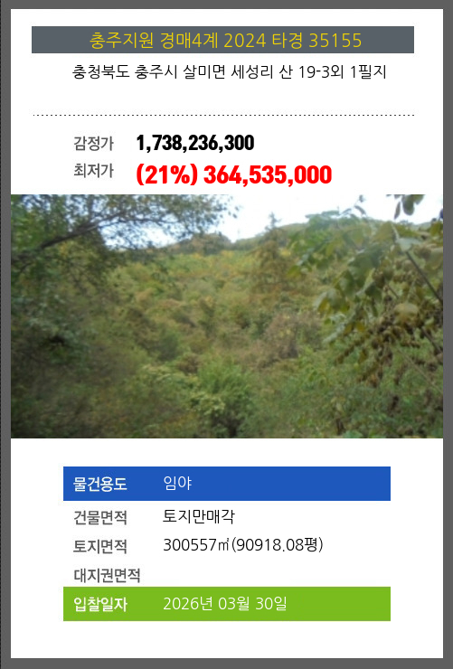 | 용도 | 임야 | 채권자 | 충** | 감정가 | 1,738,236,300 |
