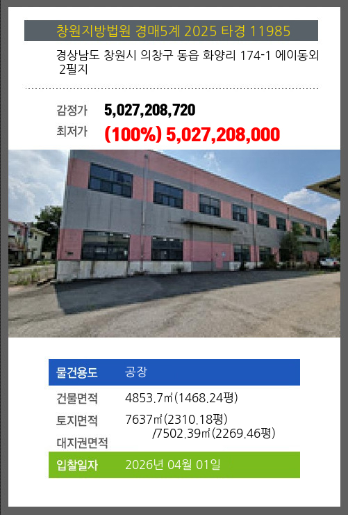 | 용도 | 공장 | 채권자 | 무** | 감정가 | 5,027,208,720 |