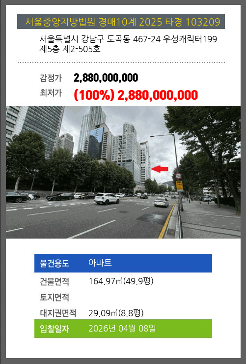 | 건물면적 | 164.97㎡ (49.9평) | 채무자 | 김** | 최저가 | (100%) 2,880,000,000 |
