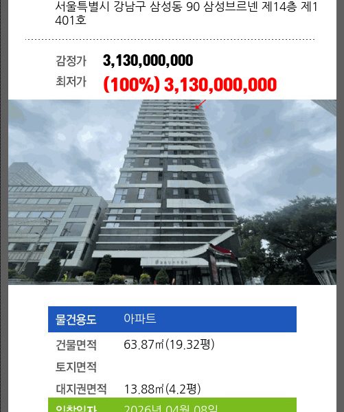 | 용도 | 아파트 | 채권자 | 시**외1명 | 감정가 | 2,880,000,000 |