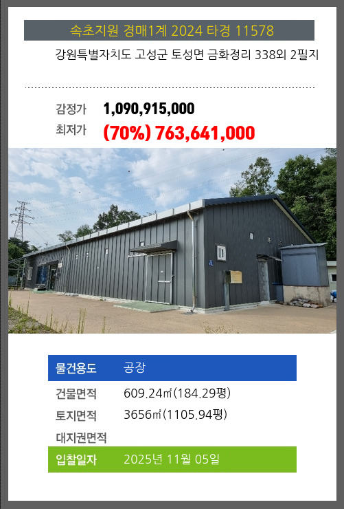 | 소재지 | [지번] 강원특별자치도 고성군 토성면 금화정리 338외 2필지 [도로명 주소] 강원도 고성군 토성면 이른계길 98-44외 2필지 |