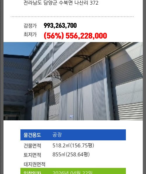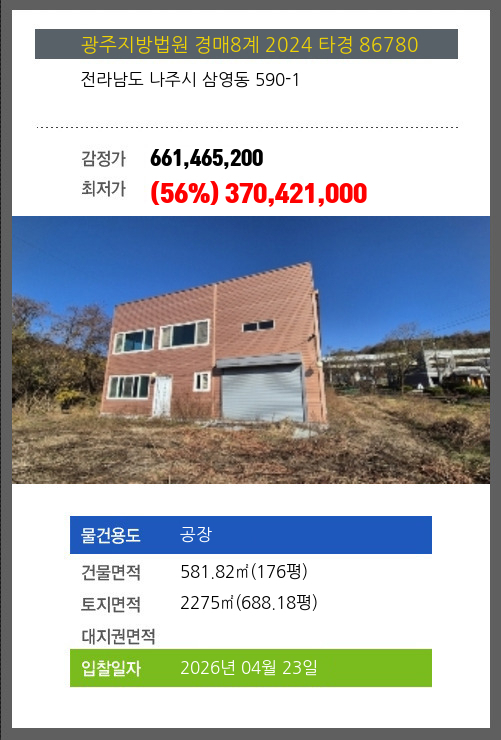 | 용도 | 공장 | 채권자 | 광** | 감정가 | 661,465,200 |