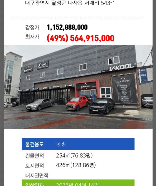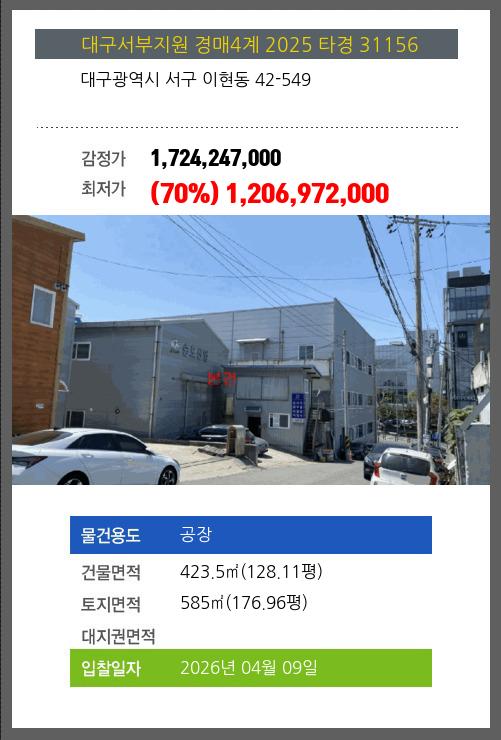 | 용도 | 공장 | 채권자 | 청** | 감정가 | 1,724,247,000 |