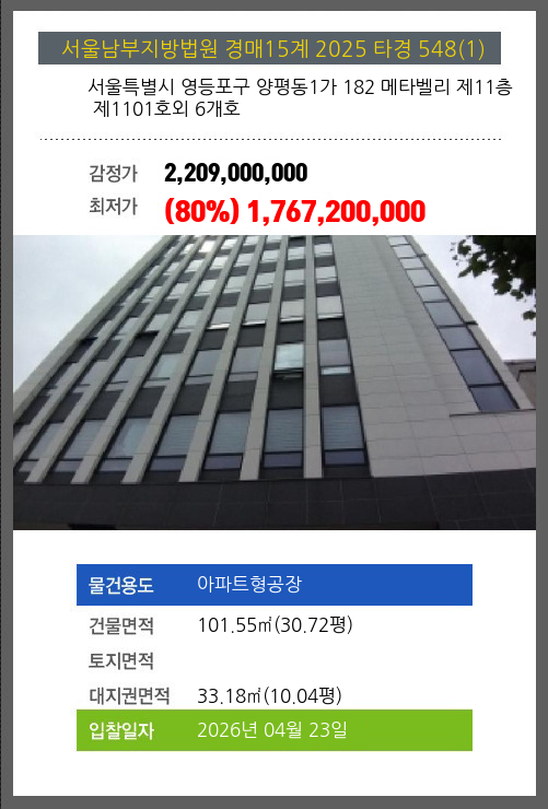 본건은 서울특별시 영등포구 양평동1가 182 메타벨리 제11층 제1101호외 6개호